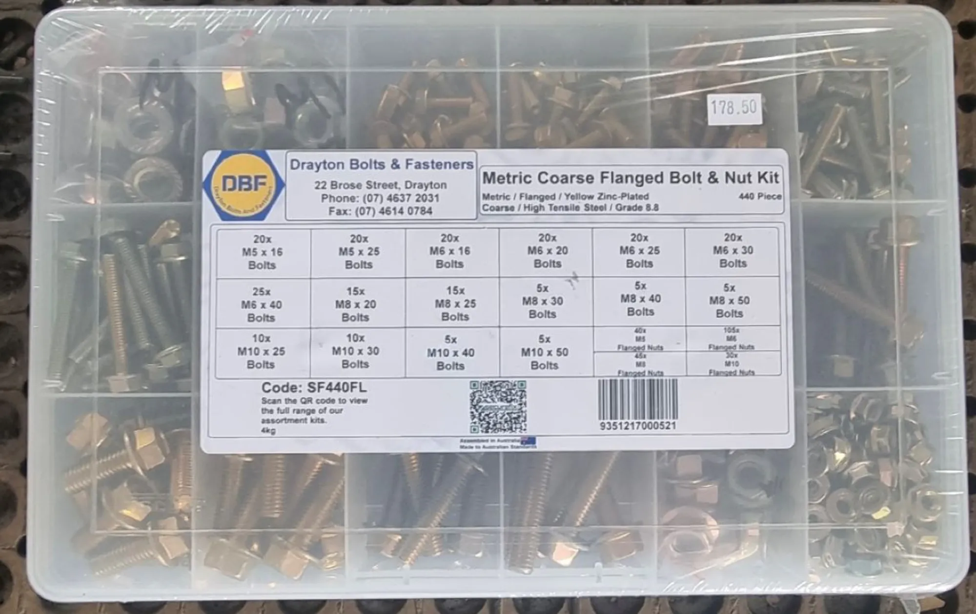 Stay ready for any repair or project with our comprehensive Metric Coarse Flanged Bolt & Nut Kit.